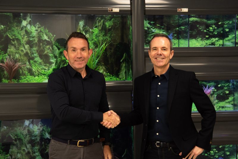 Wayne Kemp, directeur général du groupe, et Matthew Bubear, PDG de CASCO Pet, devant les enclos aquatiques de l'entreprise.